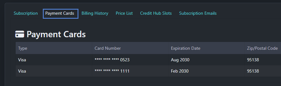 Payment Cards - Click to view a very basic summary of saved credit cards.