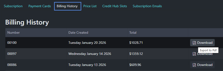 Billing History - from this screen the System Owner can download the billing history. Invoices are added to the billing history following a successful subscription payment transaction.
