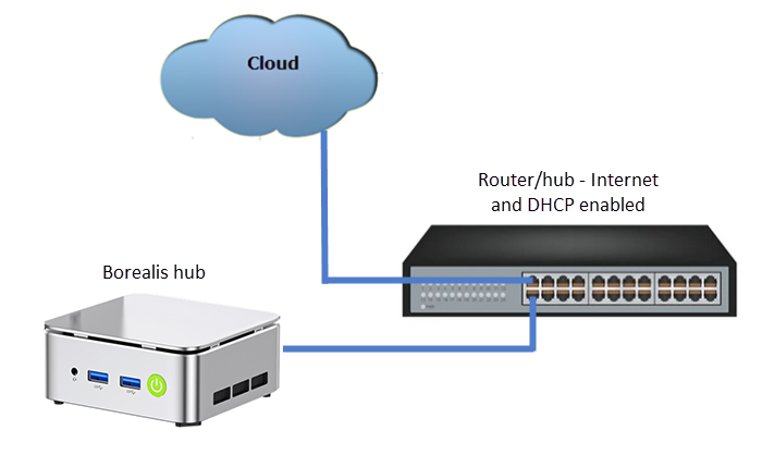 be added to a DHCP-enabled network with an active internet connection. The Borealis hub requires a DHCP-assigned IP address for it to function properly.