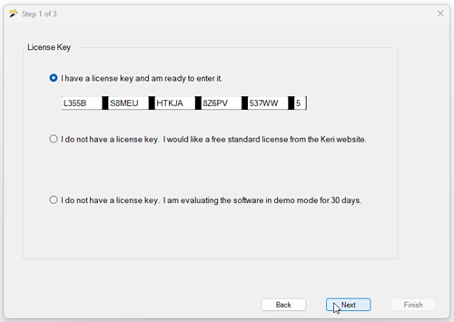 - Enter the license key - either one you have created yourself or a license that was provided by Keri Systems. If you have been emailed the license key you can copy and paste the license key into the fields. If you do not have a license key you will have to contact Keri Systems Inside Sales or you can generate a license online by clicking here. Enter your key then click Next.