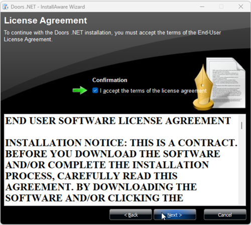 - Next, read through the Doors.NET license agreement then check the box to confirm the terms of the agreement. Click NEXT.