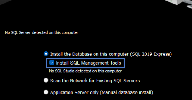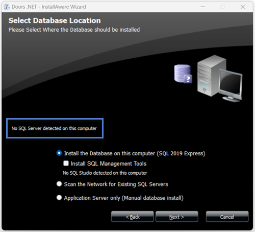 - Select Database Location - this screen will display if an existing SQL Server has been detected on the host PC. For a new installation or a new PC you will see 'No SQL Server detected on this computer'.
