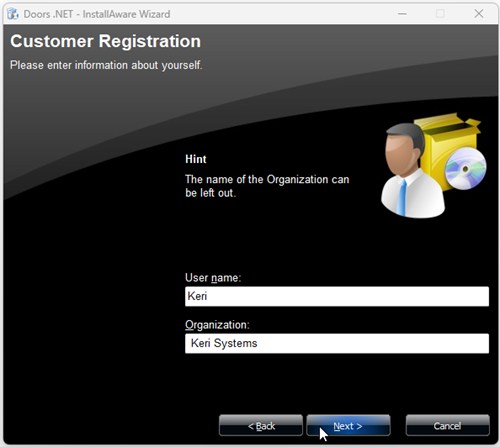 - The customer registration screen appears next. Enter a registration username and the name of your organization. This is just for registration purposes and is not the username for logging into the software. Click NEXT.