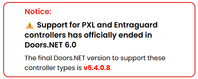 Important Note - Support for PXL and Entraguard controllers officially ended for Doors.NET with version 5.4.0.8 - this is the last version that will support these controller types and our future developments of these controllers will be in Borealis - our Cloud-based access control platform.