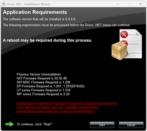 - You will now see the Application Requirements screen - for an existing system you will see that an uninstall of the current version is required and you will also see the required firmware versions for any controller types that support a flash firmware upgrade. Click NEXT or START if you have an existing installation.