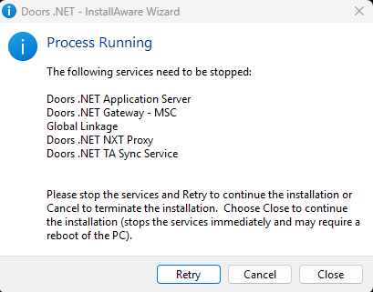 - Once the installer has opened, for an existing system you will see the notification that the Doors.NET Windows services are still running. At this point you can go to Control Panel >> Administrative Tools >> Services, stop the Doors.NET services and then click retry, or you can just click the CLOSE button, the installer will continue but once you have completed the installation/upgrade you would then need to restart the PC.