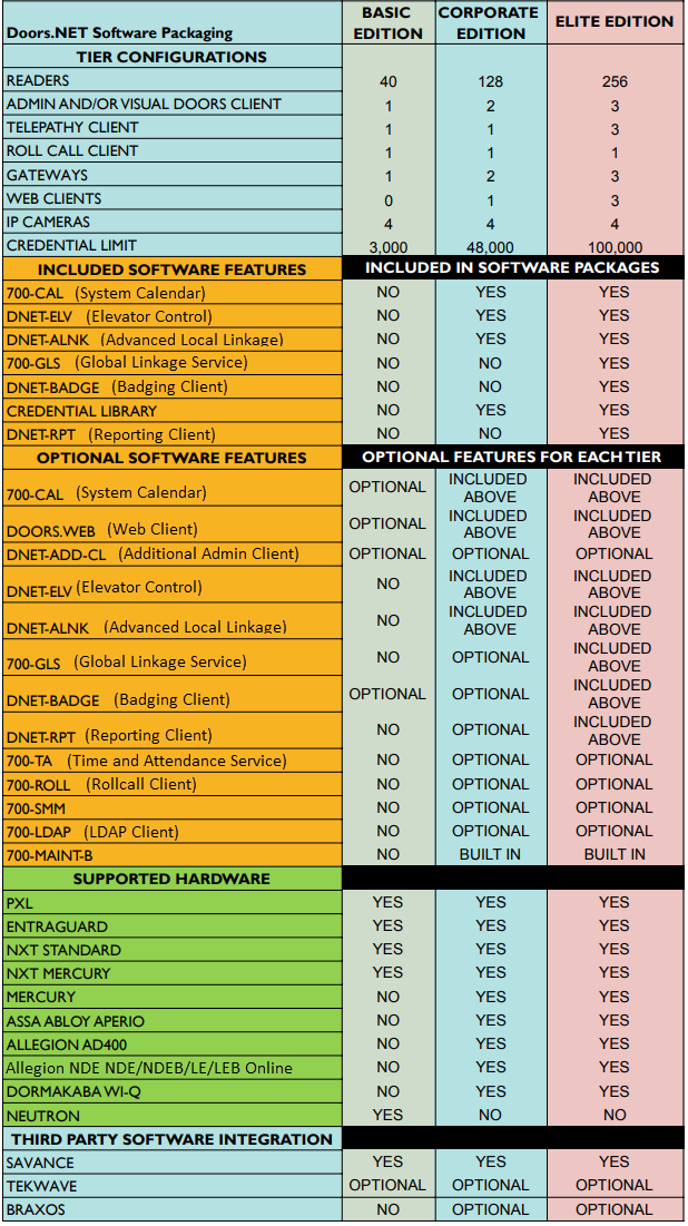 | Reader Types Supported | MS, Wiegand, Proximity, Magnetic Stripe (Wiegand Output), Bar-Code, Keypad & Biometric | MS, Wiegand, Proximity, Magnetic Stripe (Wiegand Output), Bar-Code, Keypad & Biometric | MS, Wiegand, Proximity, Magnetic Stripe (Wiegand Output), Bar-Code, Keypad & Biometric, OSDP |