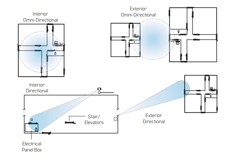 Wi-Q Gateways and Controllers support two antenna types; omni-directional and directional. Omni-directional antennas provide coverage in all directions (but over a shorter distance), whereas directional antennas provide point-to-point coverage (but over a longer distance).