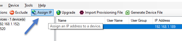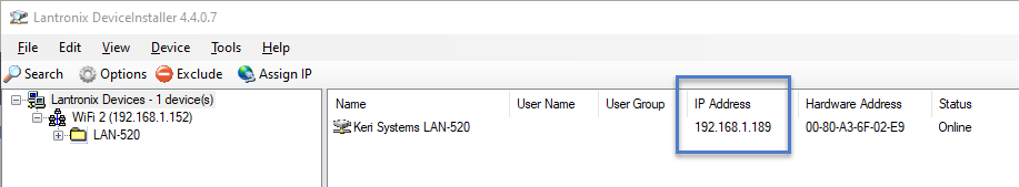 - You can now close the IP assign window and you will see that the LAN-520 is now displaying the new assigned IP address.