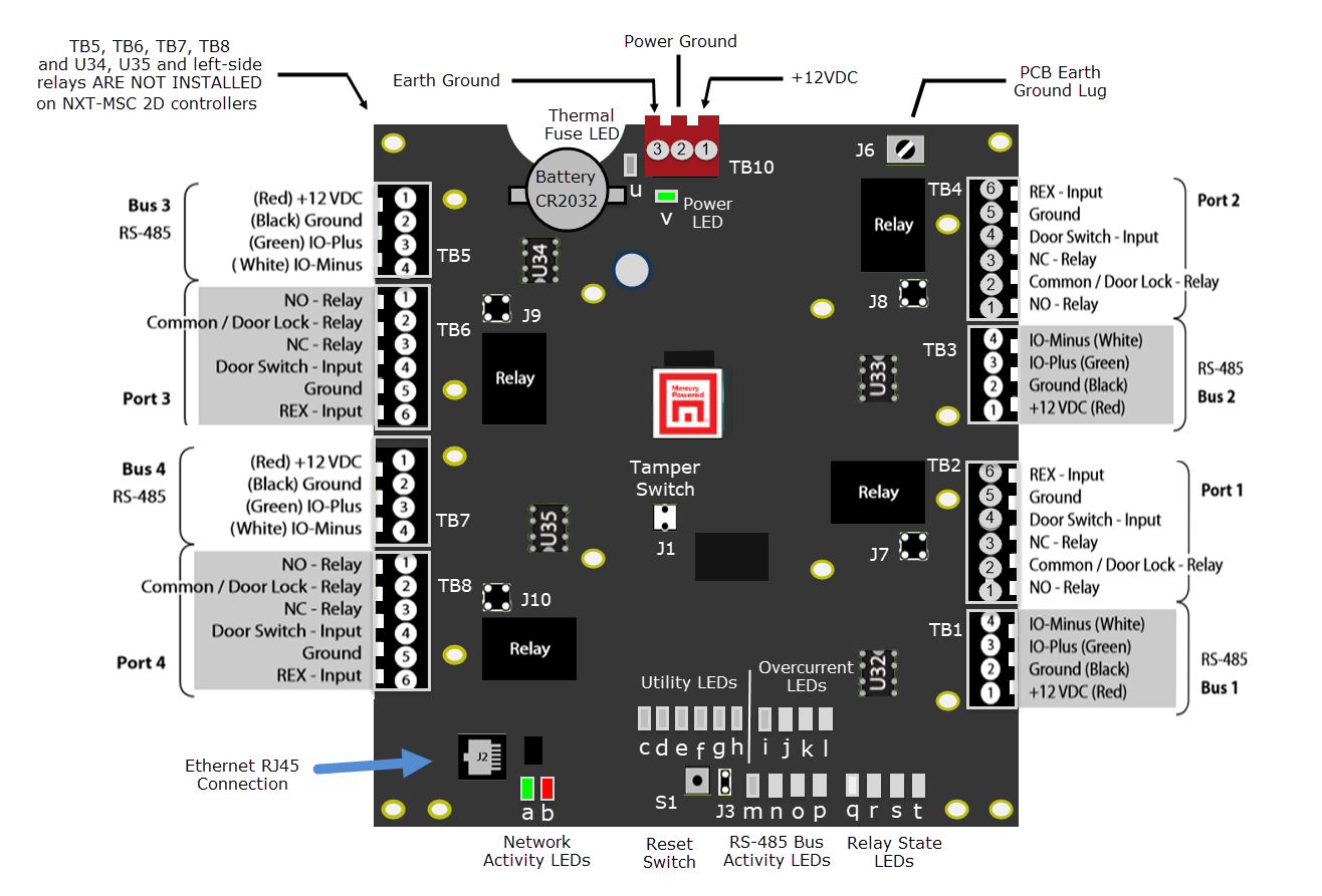 | These LEDs go solid red when the corresponding relay is activated. For example, using the default controller settings, D3 LED will go solid red when door 1 is unlocked. Note: A 2-door controller does not have LEDs s (D13) or t (D18). |